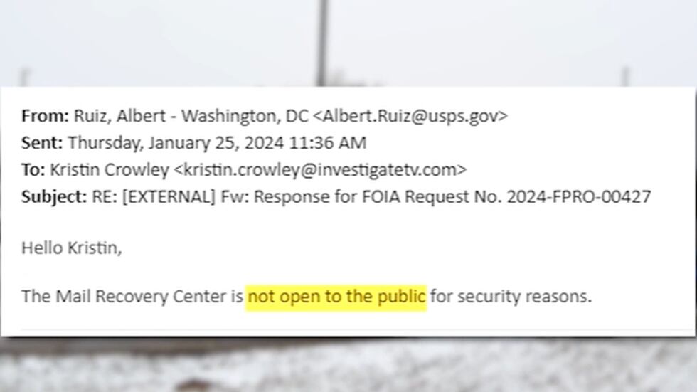 The OIG declined InvestigateTV+’s request for an interview. USPS will not provide an exact address for the facility due to security reasons or allow families – Jelinek, Eckler and Smith included – access inside.